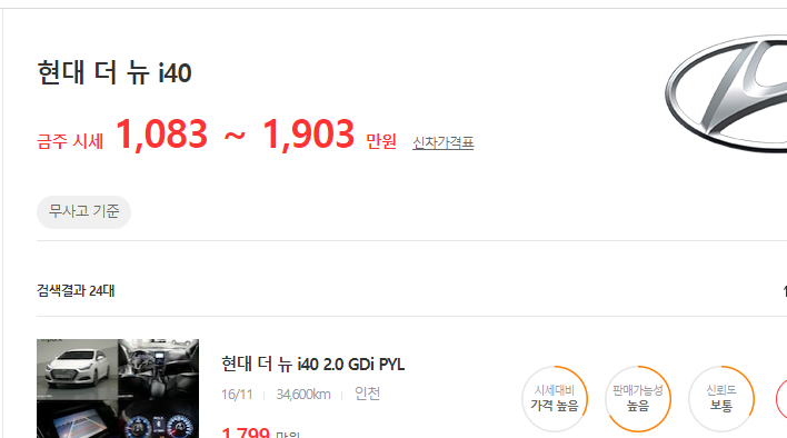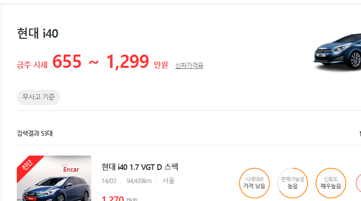현시점(21년 5월) 엔카 기준 최저 655만 원(페리 전 모델) ~ 최고 1,903만 원(페리 후 모델)의 가격대가 형성되어있기에 1500만 원 이하의 예산을 잡고 계신 사회초년생분들이 나름대로 접근하기 용이한 가격대를 형성하고 있습니다. 아무리 차량을 추천해 드린다지만 I40는 이제는 두 세대 전의 구형 플랫폼입니다. 그렇기 때문에 1500만 원을 오버해서 구매를 할 가치는 없다고 생각되며, 후술 하겠지만 깡통 등급에도 옵션이 괜찮게 들어가 있기 때문에 무조건 최고등급의 풀옵션 차량을 고집하시는 게 아니라면 비교적 저렴하게 낮은 등급을 선택하셔도 괜찮게 운행하실 수 있을 거예요