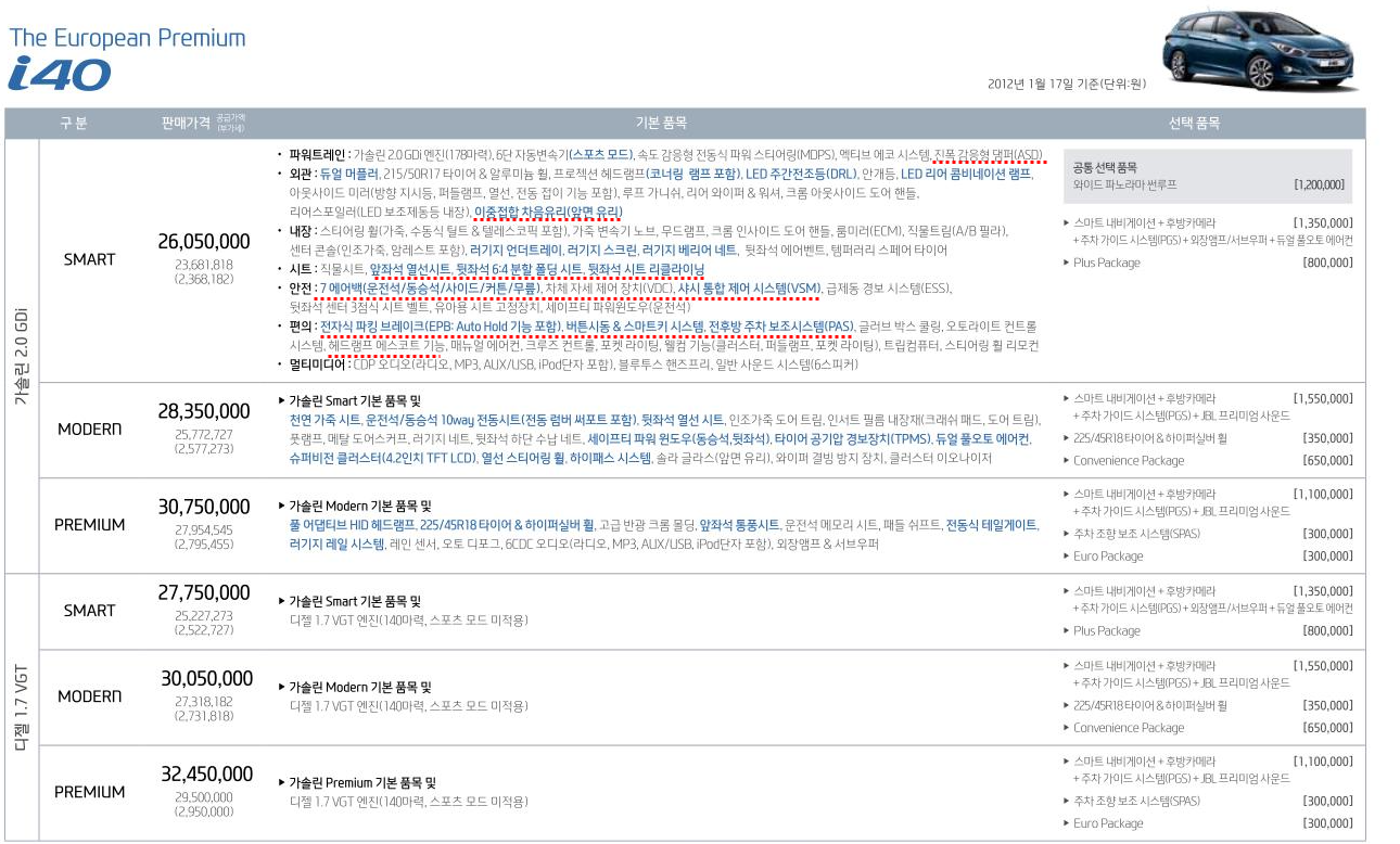 I40의 경우 12년식이 원가절감이 들어가기 이전이라 레인센서, 전 좌석 풀오토윈도우, 엔진룸 격벽, AFLS등의 옵션이 들어가 있고, 13년식 이후로 옵션이 하나 두 개씩 빠지면서 원가절감이 되기 때문에